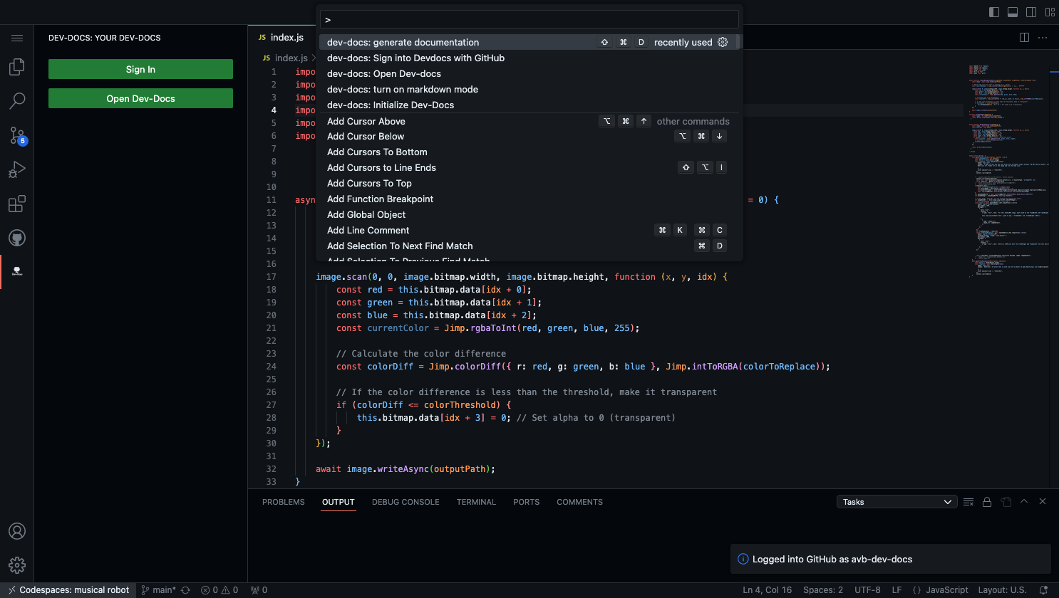 Make sure you are signed in and then select the file you wish to be documented. From there, open the command palette, search and select dev-docs: generate documentation or run shift command d.